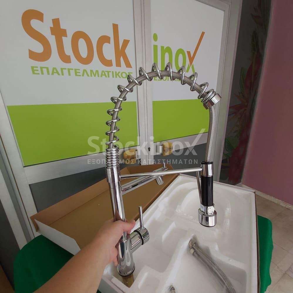 Διαθέτει ενσωματωμένη μπαταρία ανάμιξης για ζεστό και κρύο νερό. Τοποθετείται στις υποδοχές της βρύσης της επαγγελματικής λάντζας. Κατασκευάζεται από ανοξείδωτο υλικό.
